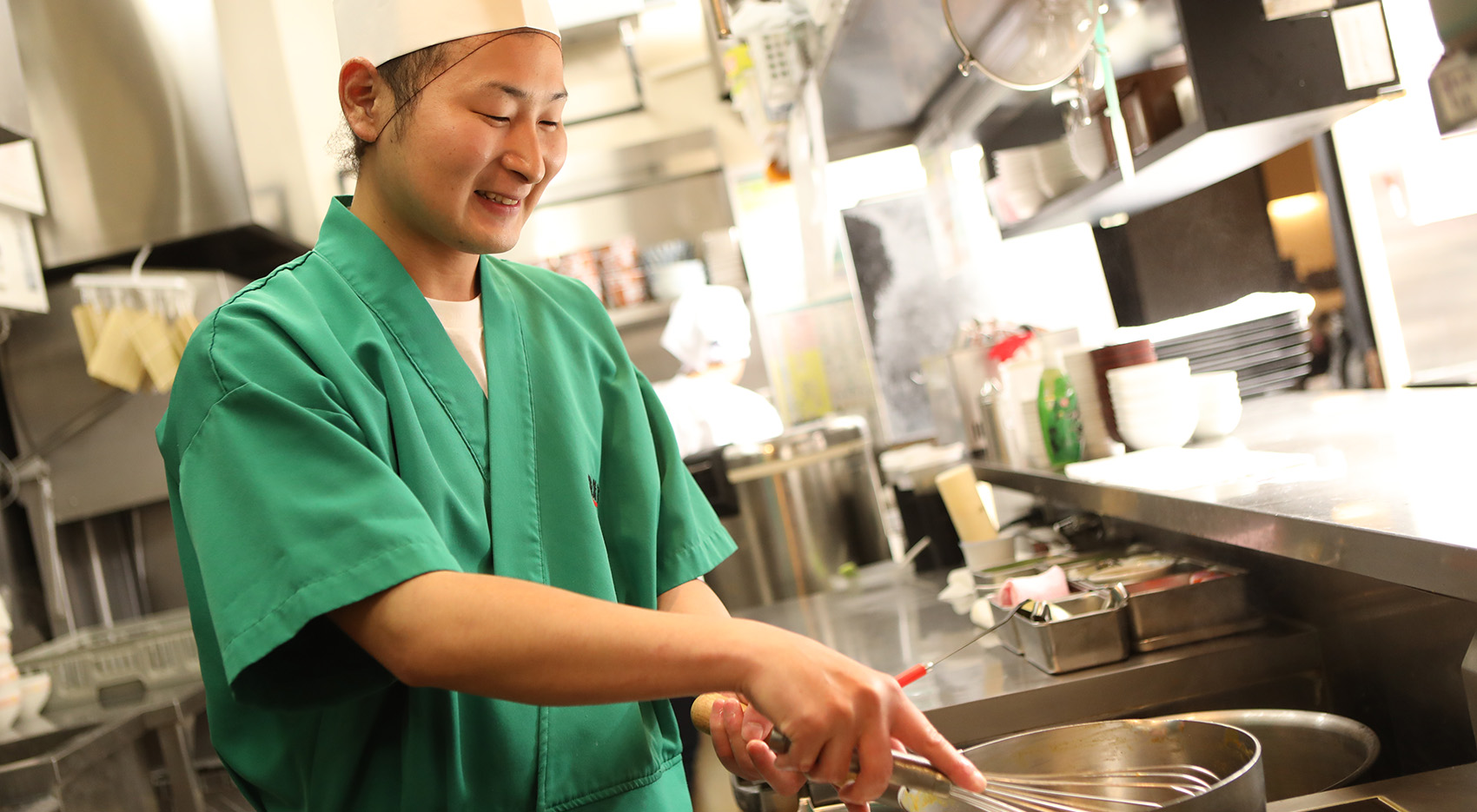 2010年入社。調理担当スタッフとしていくつかの店舗を経験し、2017年新規オープンを機に現在の店舗に着任。店舗を運営しながら、パート・アルバイトの調理指導も行なう。その丁寧な指導ぶりには定評があり、入社検討者向けの店舗見学会の講師も担当する。